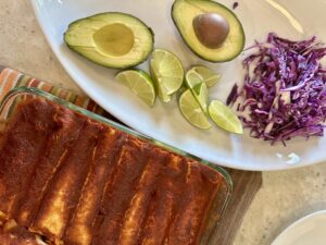 - Serve the enchiladas with the cabbage, lime, cilantro, green onion, and avocado.